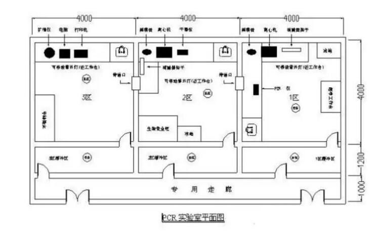 试剂储存和准备室(标本制备区),仪器主要配置有:冷冻离心机、生物安全柜、冰箱、可移动紫外灯、全自动力核酸蛋白纯化仪、专用工作服和工作鞋等。扩增反应混合物配制和扩增区配置有:冰箱、高速离心机、超净工作台、PCR仪(要求负压状态)、可移动紫外灯、微量加样器、核酸扩增仪等。扩增产物分析区主要配置有:移液器、振荡器、超净工作台、毛细管电泳仪、冰箱、离心机、微量加样器、可移动紫外灯等。PCR实验室设计方案如下图所示: