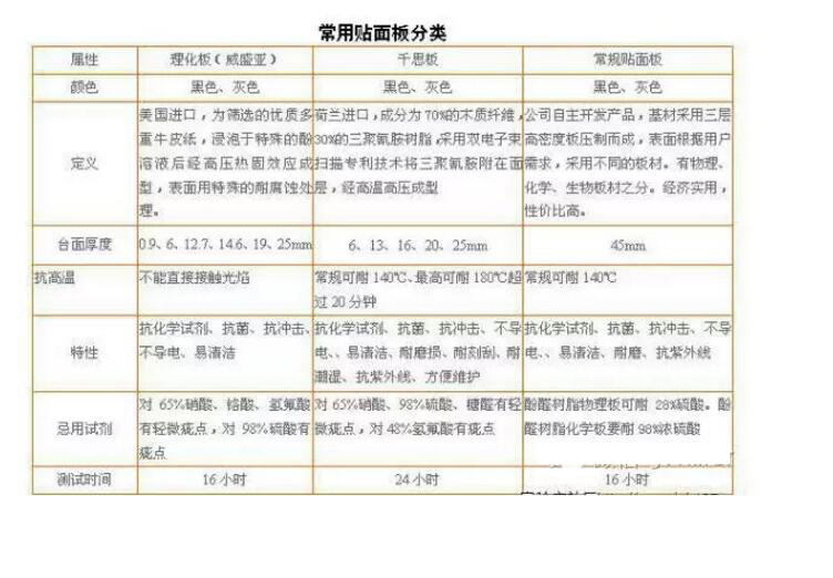 化学实验台面:防强酸、强碱、耐高温;耐98%的浓硫酸;表面材质为酚醛树脂板