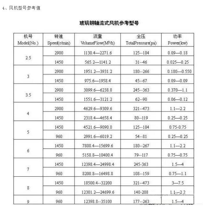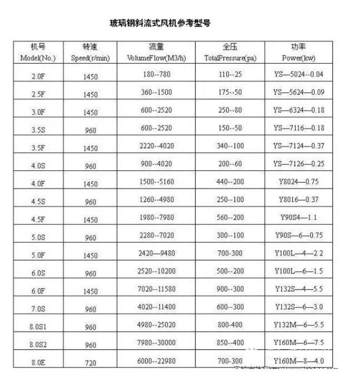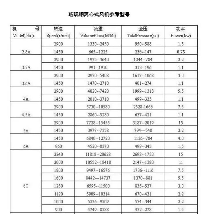 目前我们公司主要采用的风机主要有轴流风机(斜流风机、管道风机)、离心风机。轴流风机适用于风压小、适用于管路短的通风系统(一般10米以内,否则易造成抽不动);离心风机适用于管路长的通风系统(一般10m以外,否则易造成噪音大)。风机的材质:一般分为玻璃钢、PP、PVC、铁皮等,其中玻璃钢较多。风机的型号的选择,是根据风量和风压来选择的。