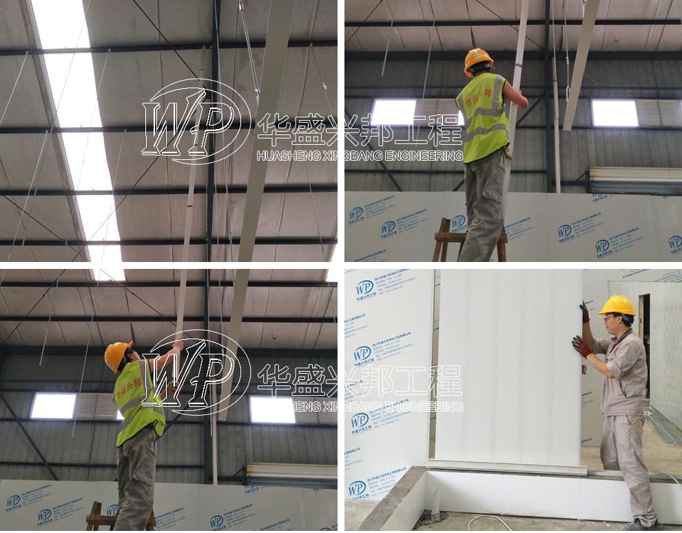 华盛兴邦厂房装修现场,成都妙仕康食品有限公司厂房装修现场,立墙板,吊顶准备中