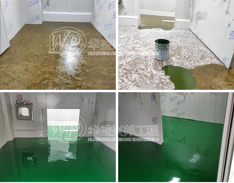 华盛兴邦厂房装修现场,四川王臻王牛肉有限公司厂房装修施工现场,主要生产肉制品。一层净化区域超耐磨面漆刮涂。
