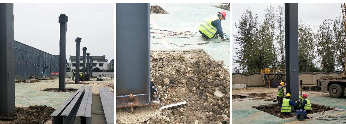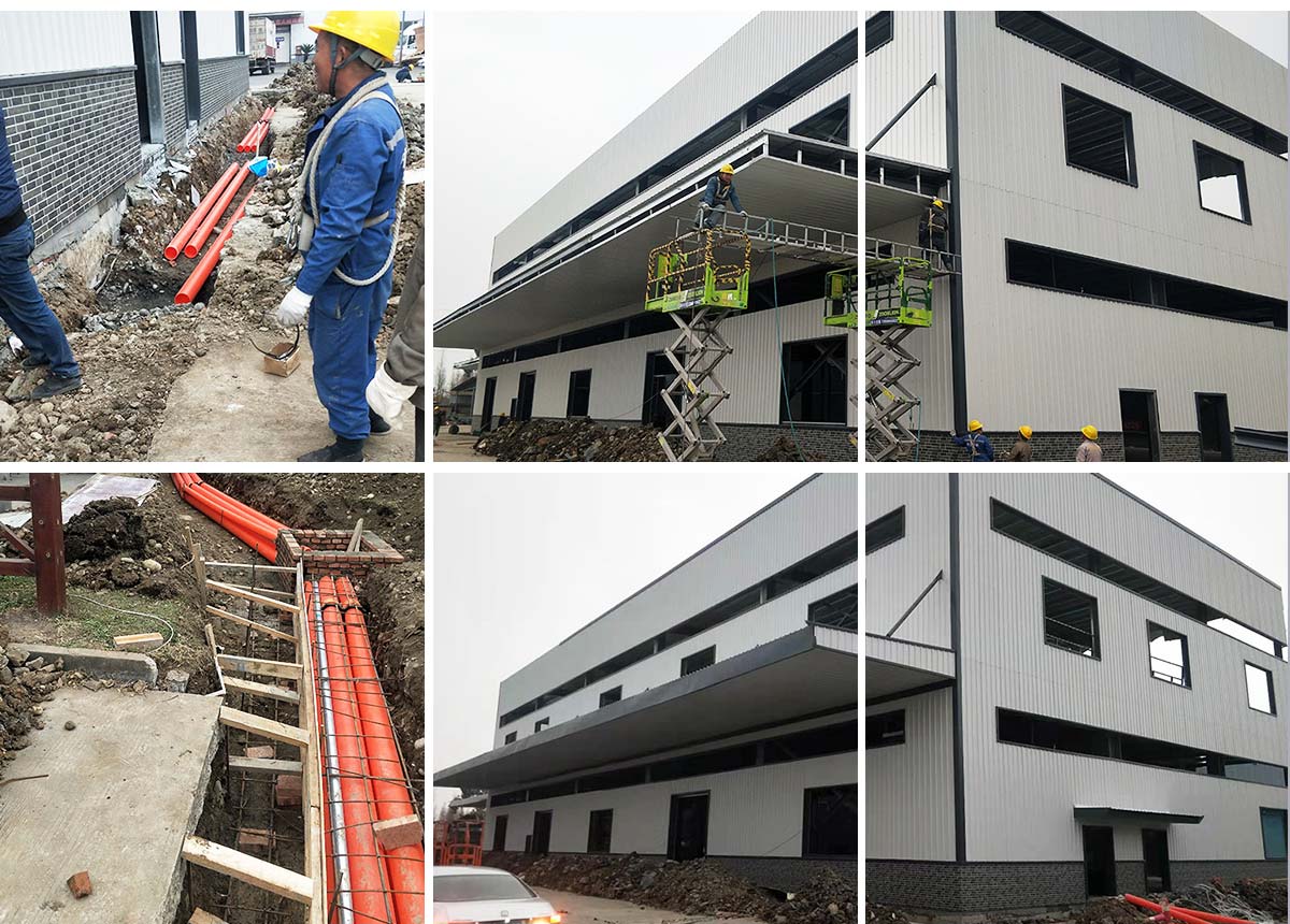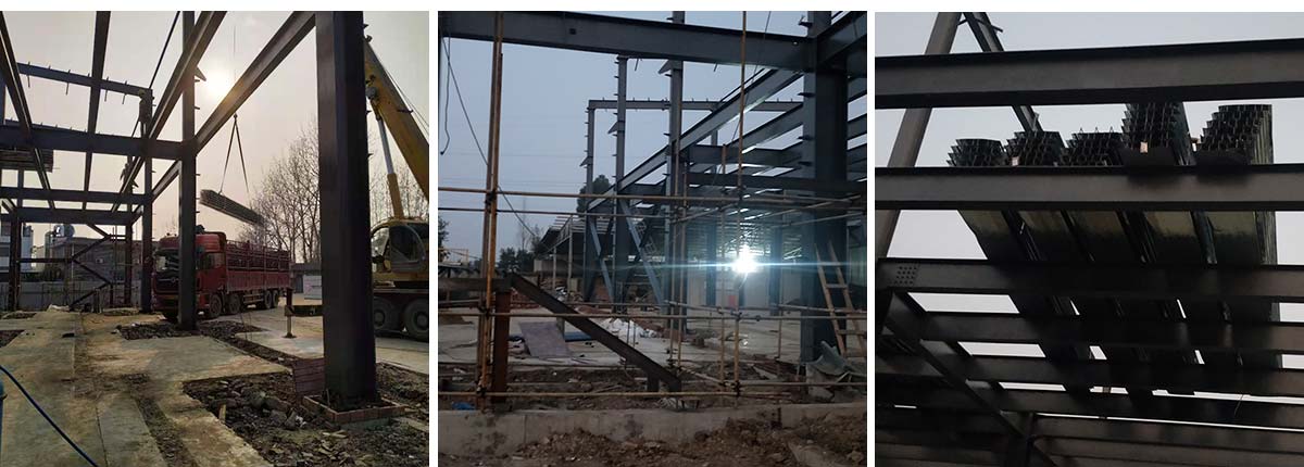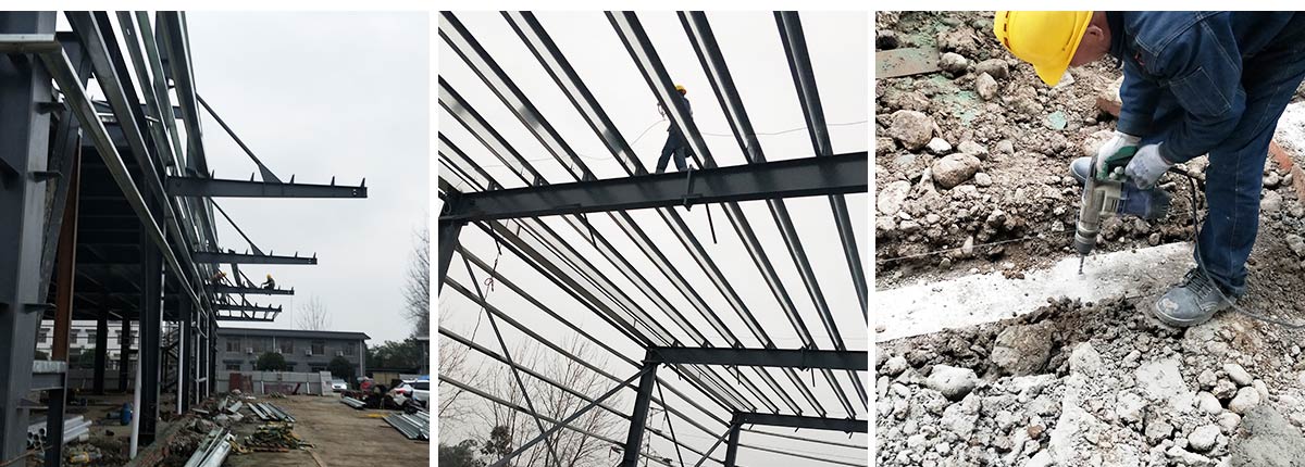 2020-11-18 四川家和原味香料有限公司土建厂房施工现场,1.楼承板安装完成30%;2.柱间支撑完成70%;3.柱脚灌浆完成100%;4.钢楼梯完成45%