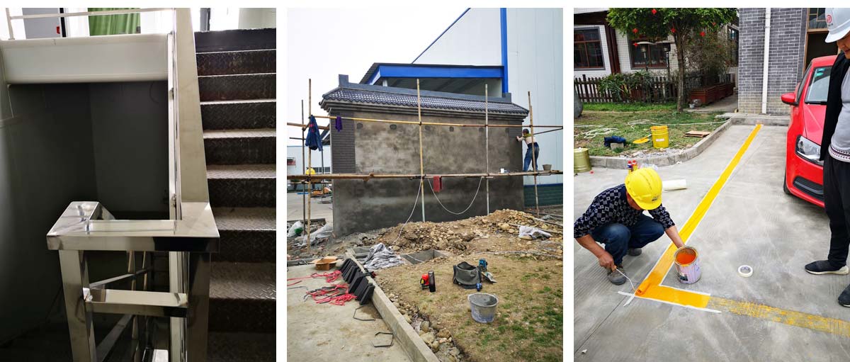 2021-3-16如实香料年净选产能8000吨技改项目——厂房土建工程施工现场:楼梯间不锈钢扶手已安装,下午来收尾,室内电箱门窗外框需要整改,室外屏风墙面砖开始铺贴,地面停车线画线。