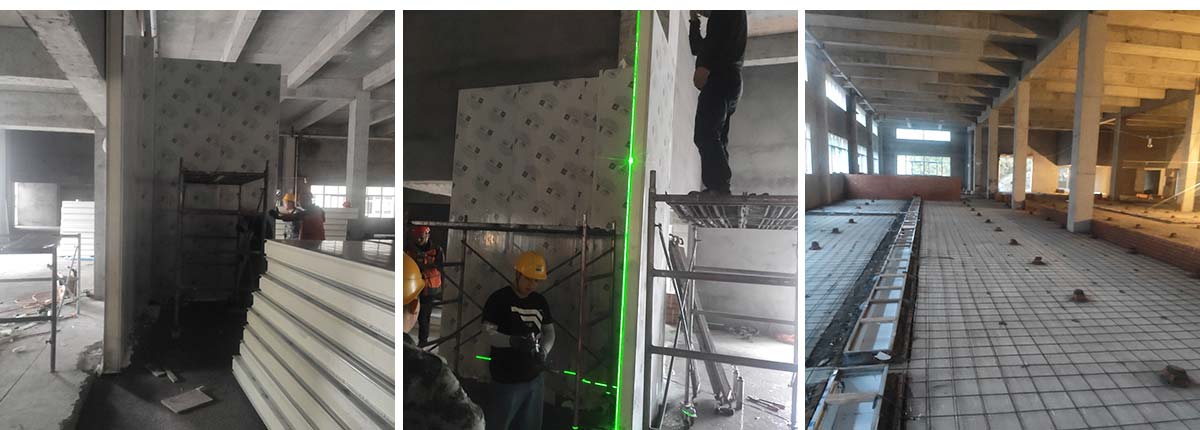 2020-12-20四川哈笼餐饮管理有限公司哈笼包子厂房装修现场:中央厨房开始打胶 二车间材料进场开始立墙板