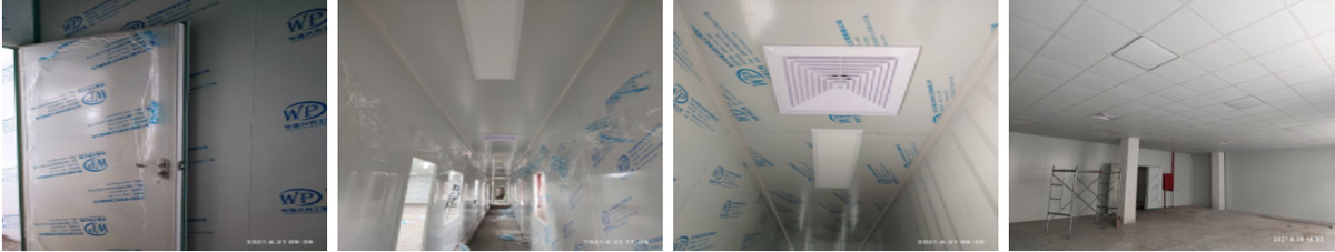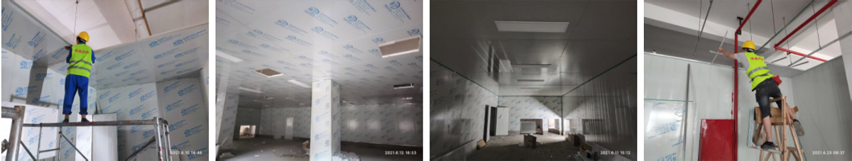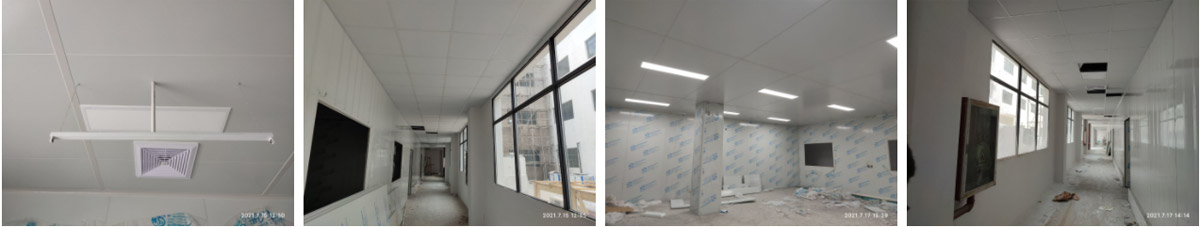2021-6-21 铜仁追花族科技有限公司厂房施工现场: 1.顶板撕膜打胶完成35% 2.彩钢板区域换气扇安装完成70% 3.门锁安装完成70%