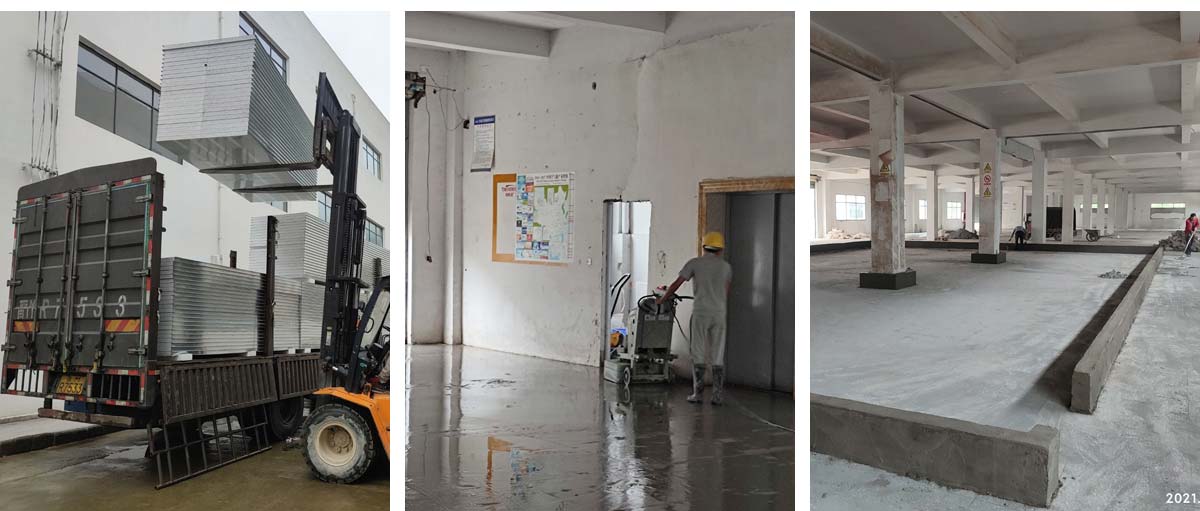 2021-5-22 铜仁追花族科技有限公司厂房施工现场: 1,挡水墙完成; 2,固化地坪打磨完成近一半; 3,隔断彩板到货三分之一。