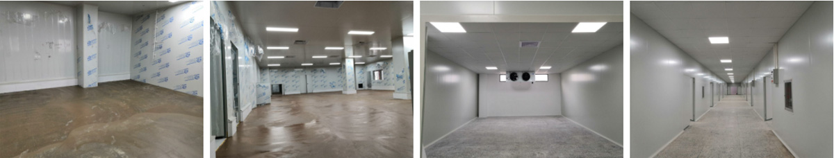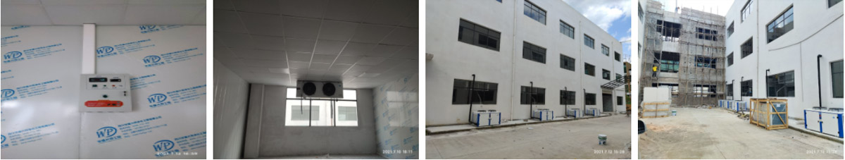 2021-7-12铜仁追花族科技有限公司厂房施工现场:1.冻库空调铜管焊接和保温,控制线安装完成,保压完成,冷凝水管完成。 3.瓷砖铺贴完成90%; 4.刮墙面头道腻子完成75%