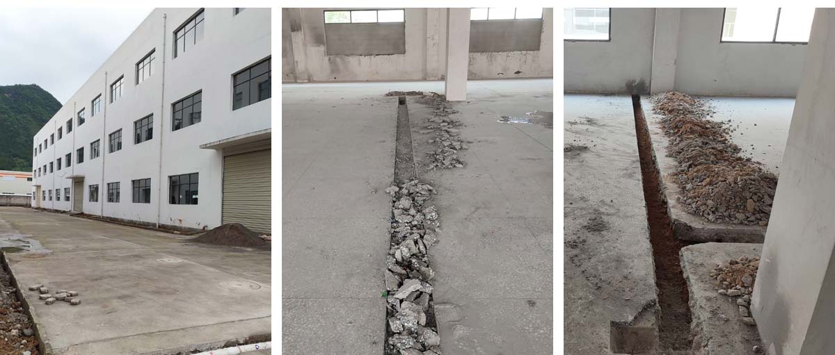 2021-5-9 铜仁追花族科技有限公司厂房施工现场:1:排水沟切割,破除完成15%。