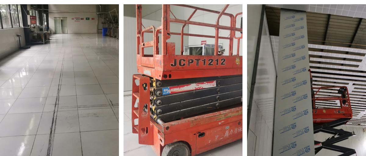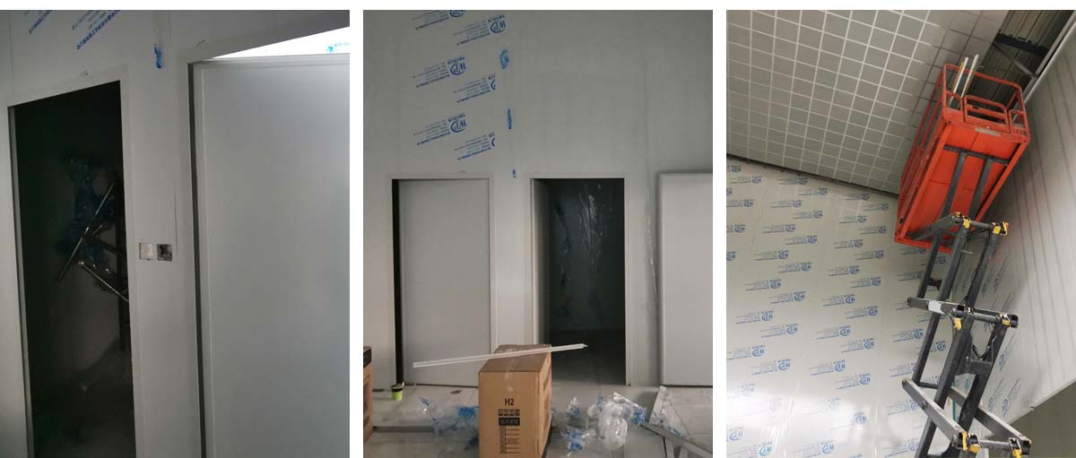 2021-5-23都江堰廖排骨改造项目施工现场: 1:墙板完成; 2:三防板顶板完成,铝扣板恢复完成; 3:门窗完成70%; 4,水电班组进场。2021-5-11~2021-5-17 都江堰廖排骨改造项目施工现场:1:进场放线, 升降机就位;2:彩钢墙板完成20%,排水恢复完成,三防板吊筋完成。