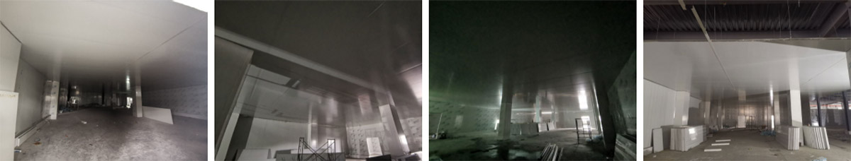 2021-11-10牧尚人家食品有限公司厂房装修现场:1、材料三防板到货 2、彩钢工程打胶安装圆弧完成总体50% 3、LED平板灯安装完成总体70%
