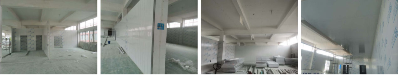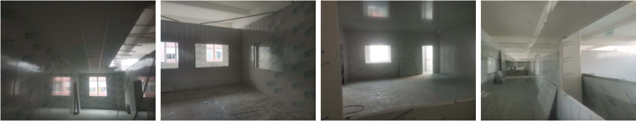 2021-9-23四川凯瑞艾特食品有限公司厂房装修施工现场:1.墙板安装完成95%(因预留设备通道,待进场后实施; 2.地槽安装完成95%; 3.顶板安装完成80%; 4.彩钢自制门安装完成30%; 5.窗洞开设完成100%; 6.三防板吊顶完成20%; 7.水电安装完成5%
