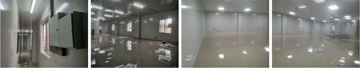 2021-10-31四川凯瑞艾特食品有限公司厂房装修施工现场:1.顶板安装完成100%; 2.三防板吊顶完成100%; 3.水电安装完成100%,灯具安装完成100%; 4.新增动力电完成100%; 5.卫生间隔墙完成100%; 6.脚踏池完成100%; 7.风淋室制作完成100%; 8.地坪腻子层完成100%; 9.板缝及地面缝隙处理完成70%; 10.场地清理。