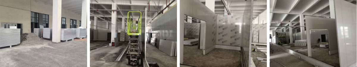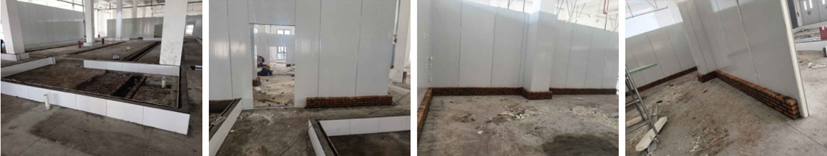 2023-3-13四川蜀风食品有限公司厂房装修现场:1,冻库内外砌砖已完成 2,排水明沟贴瓷砖施工第1天,完成分项施工40% 3,挡水墙砌墙施工第5天,完成分项工作100% 4,挡水墙贴瓷砖施工第4天,完成分项施工进度80% 5,彩钢板立墙板施工第2天,完成分项施工进度10%
