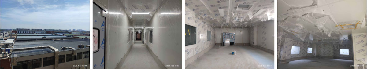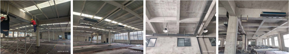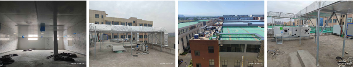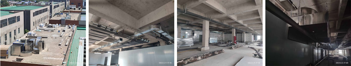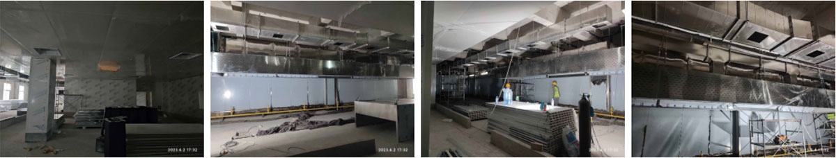 2023-6-2西安初心餐饮管理有限公司中央厨房厂房装修现场:①、第二批净化风管吊装完成85%,末端风管组装完成70%; ②、将昨日来货顶板搬运分配至各房间完成; ③、接屋面与设备连接的风管组装完成90%,二楼热加工间烟罩吊装完成80%,明日全部吊装完成; ④、一楼冻库排管铜管连接完成40%。