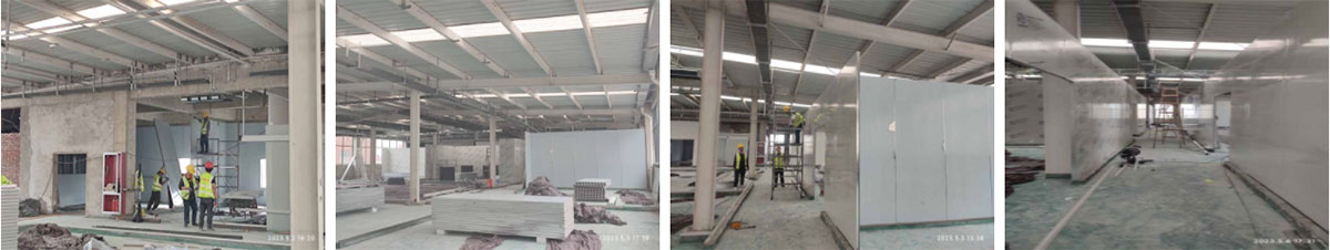 2023-5-4西安初心餐饮管理有限公司中央厨房厂房装修现场:1、三楼彩钢板墙板安装完成60%; 2、三楼风机盘管风管吊装及橡塑保温完成,新风管安装完成30%; 3、三楼电力桥架安装完成。