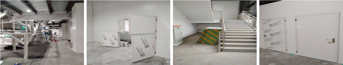2024-2-22四川君玲昌泰食品科技有限公司厂房施工现场:施工第30天 二、无安全事件 三、今日施工内容 1,门板安装 2,二楼内圆弧安装 3,墙板接缝打胶 四、今日材料进场 无 五、明日施工计划. 1,墙板接缝打胶 2,吊顶钢丝绳安装