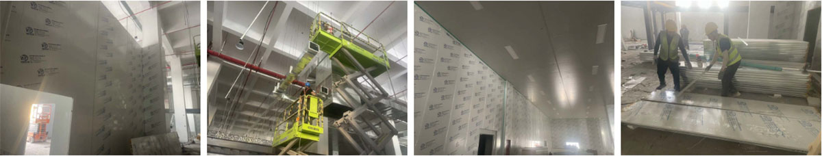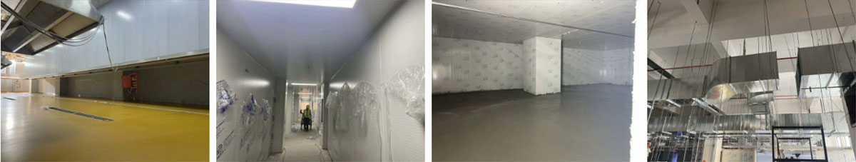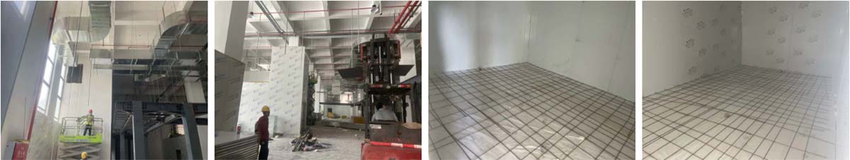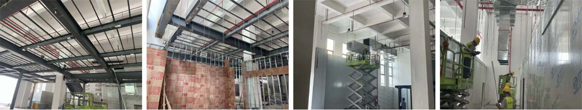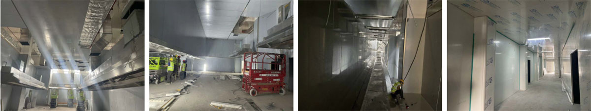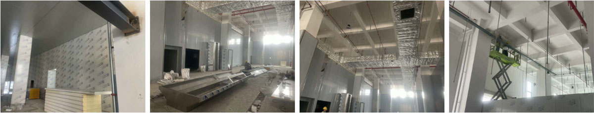 2024-9-4乐山纪六孃项目厂房装修现场:风管、净化隔断施工,冻库地坪施工