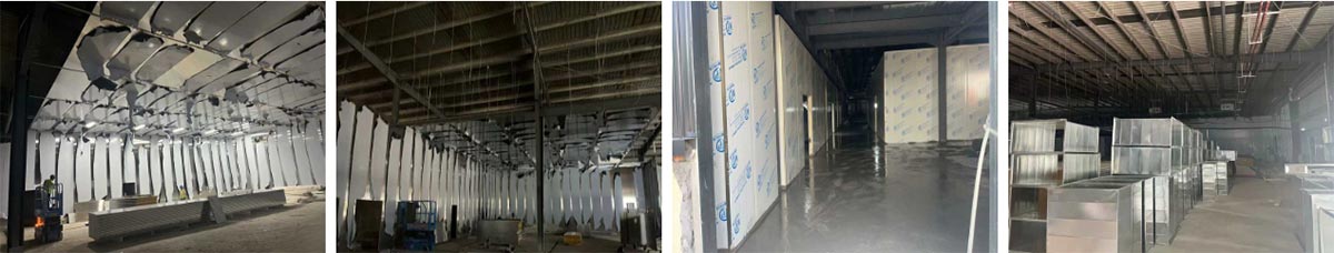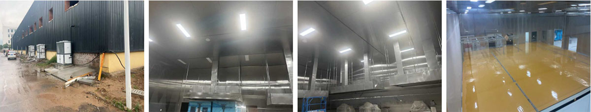 延安景泽食品肉制品项目厂房装修施工现场:部分车间开始安装设备,风管施工