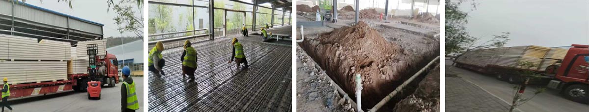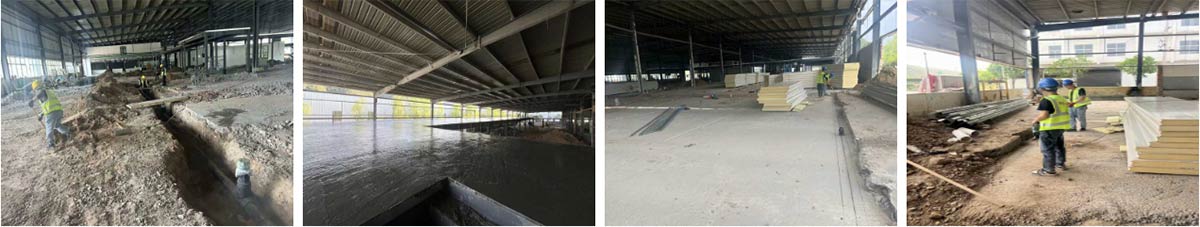 延安景泽食品肉制品项目厂房装修施工现场:冻库板材卸货,二层钢构施工,排水管道预埋施工