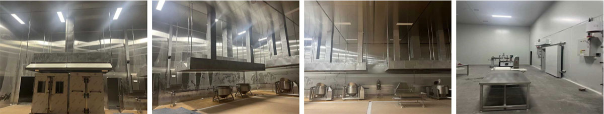 延安景泽食品肉制品项目厂房装修施工现场:烟罩施工,设备进场施工