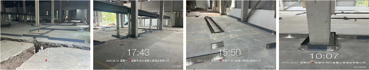 邛崃锦一食品肉制品项目施工现场:排水沟施工,钢结构平台施工