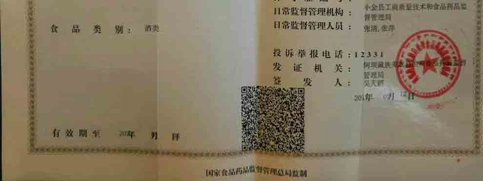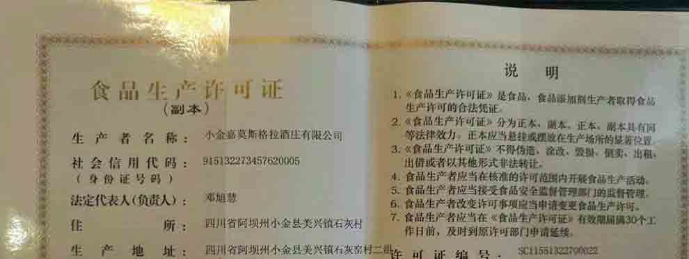 小金嘉莫斯格拉酒庄有限公司生产许可证下发