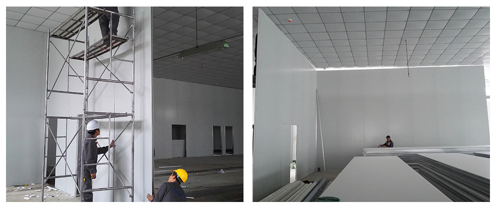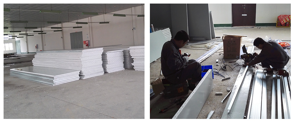 正在安装彩钢板隔断,左图工人正在认真安装,右图为已经安装好的效果图